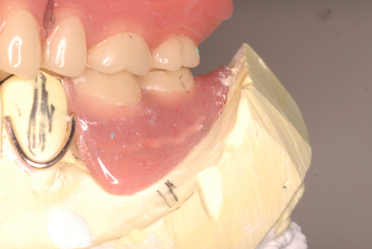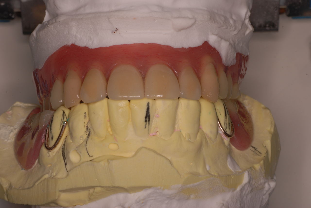 上の総義歯はまっったくはずれませんでした。下顎の入れ歯では若干痛みが出そうなので噛み合わせの調整をしています。口腔内では時間がかかりすぎるので器械に付けて調整しています。